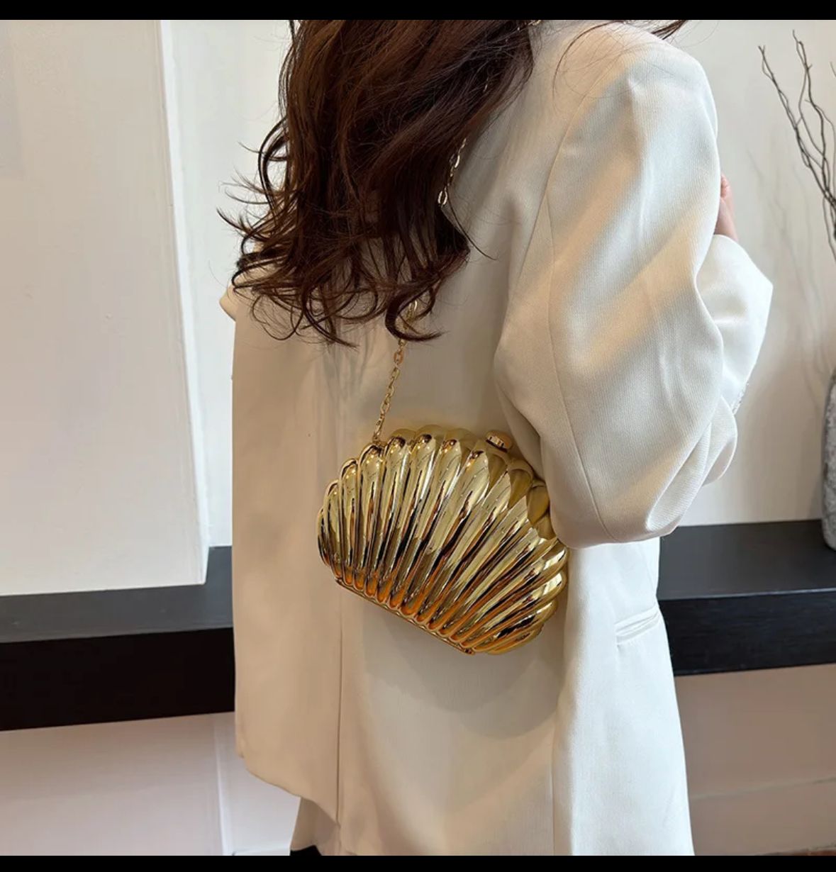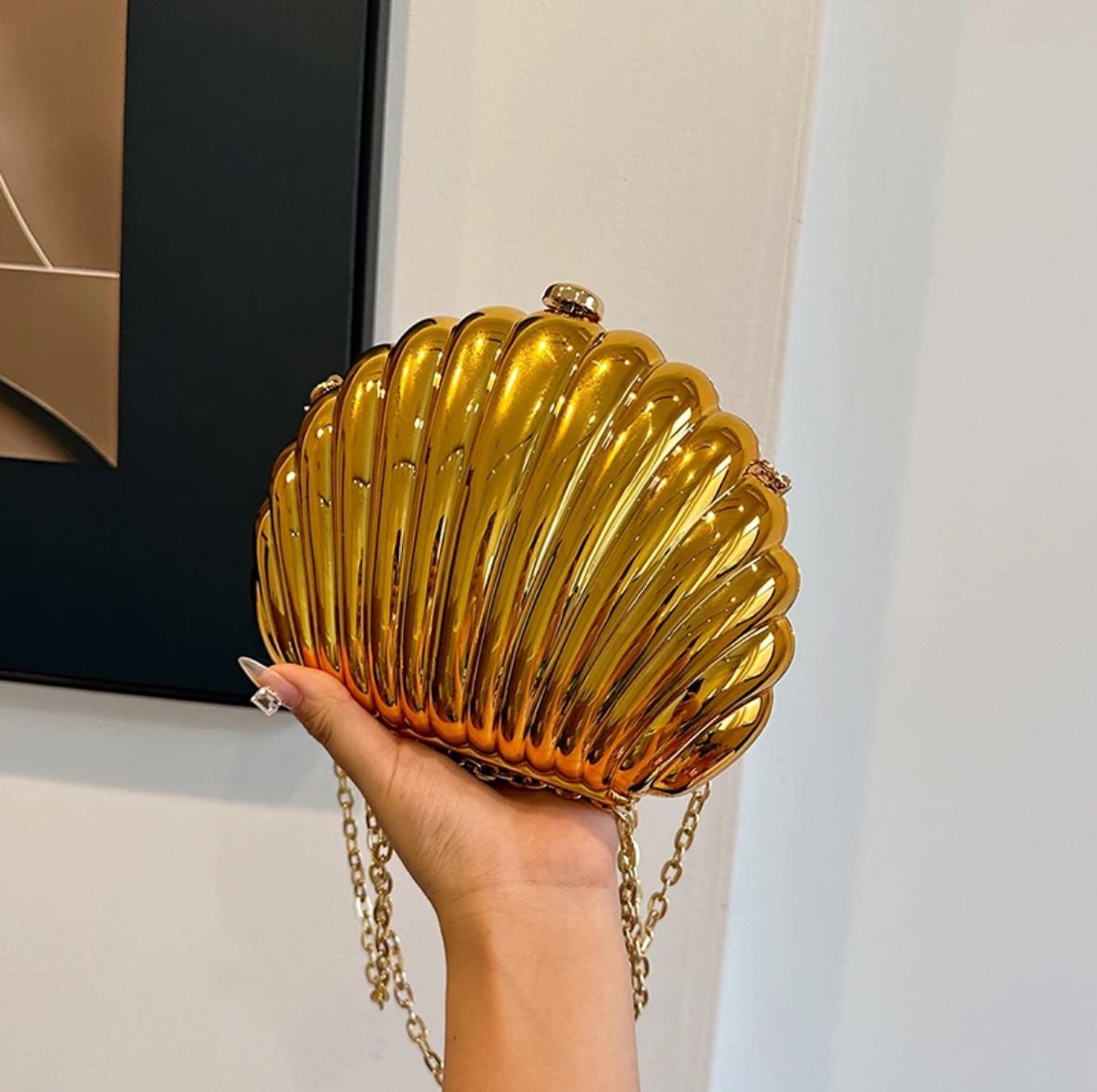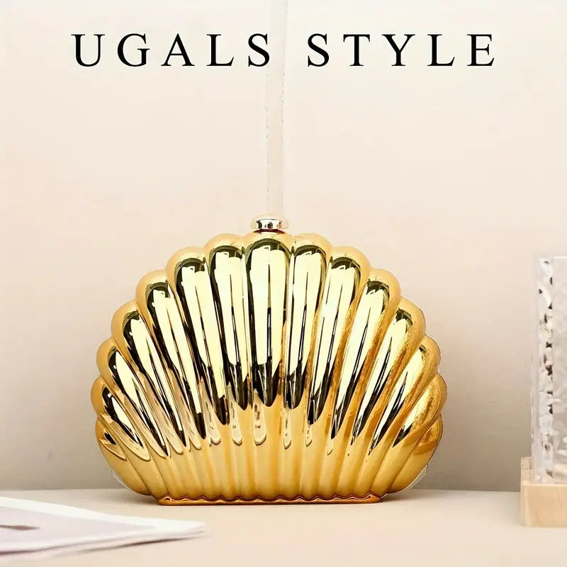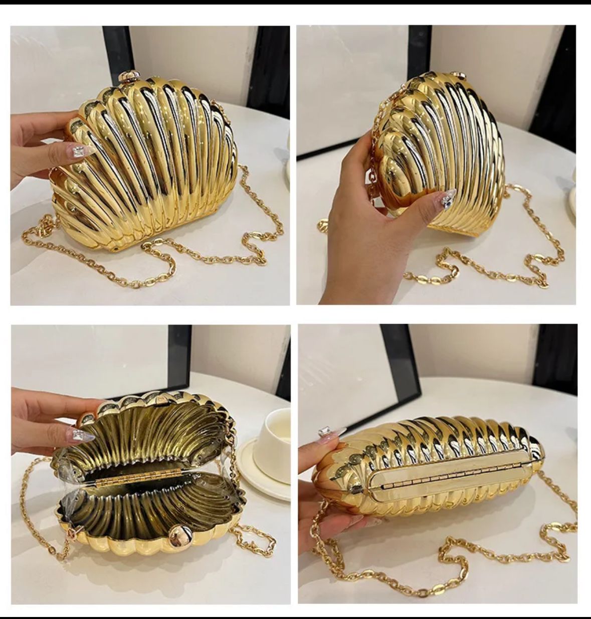 Elevate your evening ensemble with the Golden Seashell Clutch, a luxurious accessory that combines elegance with a touch of oceanic charm. Crafted in the shape of a radiant seashell, this stunning clutch boasts a high-gloss metallic finish that catches the light beautifully, ensuring all eyes are on you.