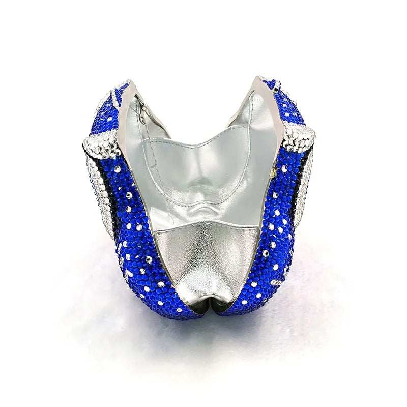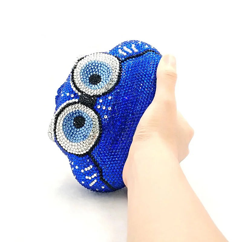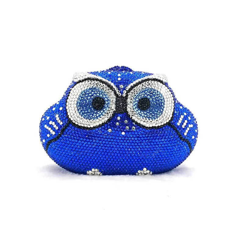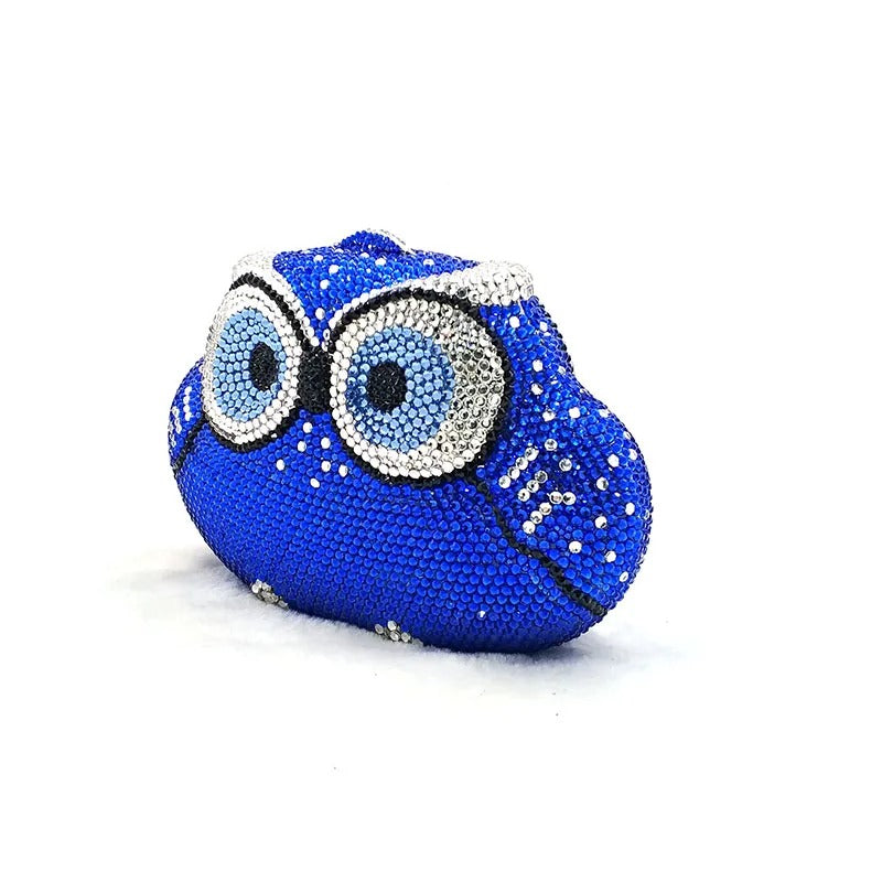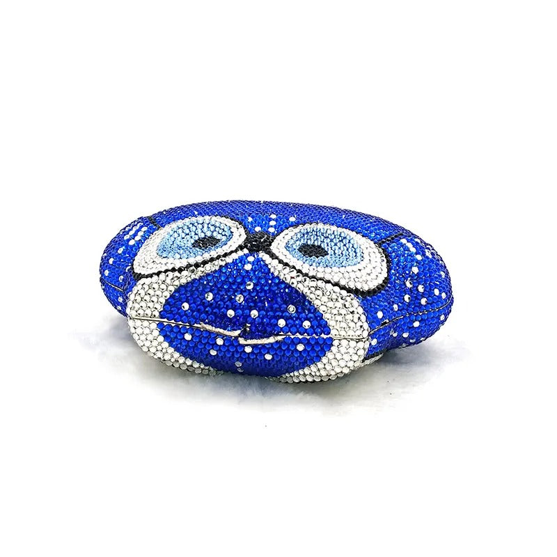 Introducing the Twilight Hoot Blue Clutch , a dazzling, owl-shaped evening clutch designed to make a statement. This vibrant blue accessory is encrusted with shimmering crystals, giving it a luxurious and sparkling finish.
